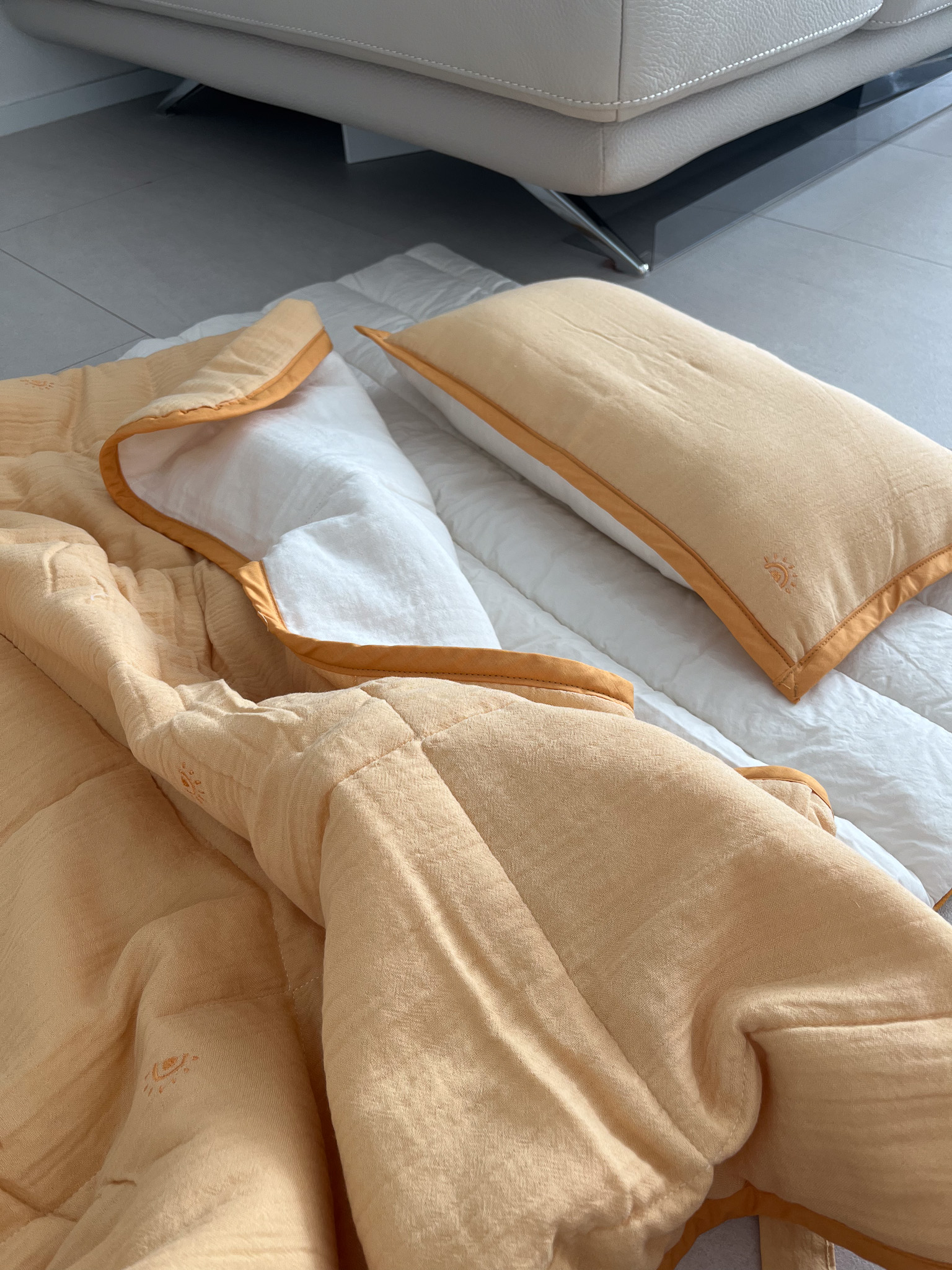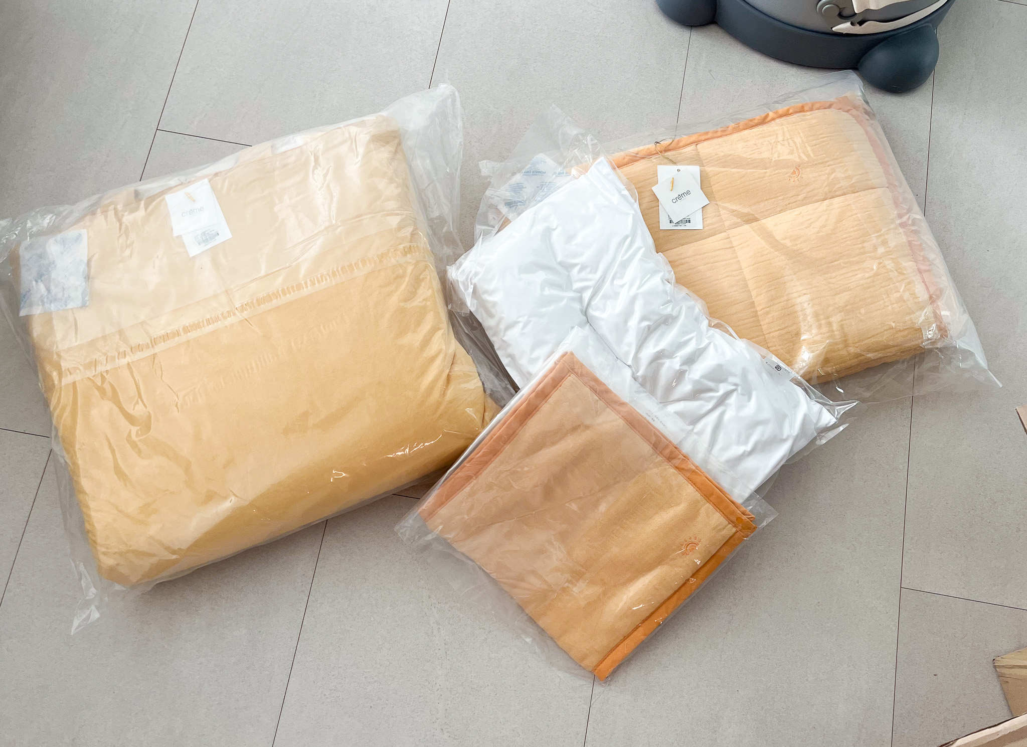 이 이불과, 베게 커버 재질이 진짜 좋다. 뭐랄까 거즈면 같기도 하고 부들부들... 소재가 고급지다. 베게는 세트로 하길 너무 잘한것 같다. (세일 상품에서 안고르길 잘했음.. 👍)